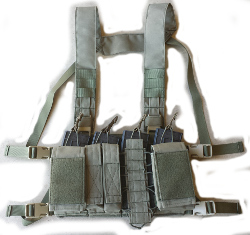 | Variable Objective Chest Rig 3 Mag - Left Handed | The 3 mag VOCR footprint is approximately 6.5" x 9". Standard Configuration is - 3 M4 magazines 2 lidded pistol magazine pockets (sized to accomodate most handgun magazines, as well as multitools and 2cell combat lights) 1 STUFF-IT expandable pocket (patent pending) 1 General Purpose (GP) pocket In a left handed shooter pocket placement. The VOCR3 is ideally sized for concealed/confined space roles Compatible with most buckle/modular armor chassis platforms (Velocity Systems / EGL / Rogue Gunfighter) |